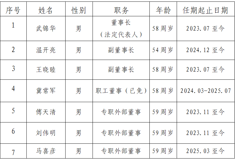 1.董事會成員:董事長(法人代表)1名;副董事長2名;董事4名(外部董事3名,職工董事1名)。